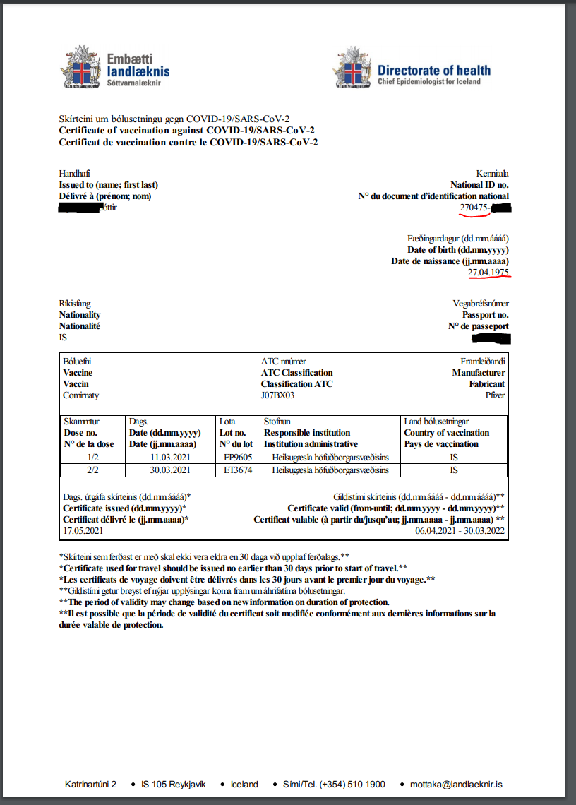 Islandes Covid-19 apliecinājuma paraugs